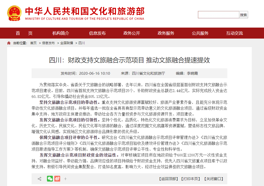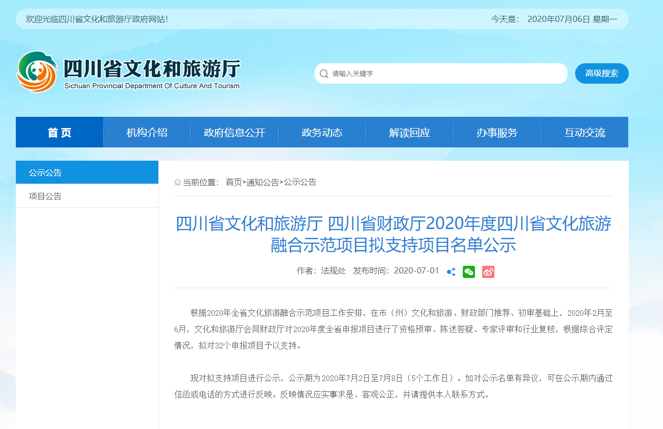 2020年7月1日,四川省文化和旅游廳正式發布了關于《四川省文化和旅游廳、四川省財政廳2020年度四川省文化旅游融合示范項目擬支持項目名單公示》。