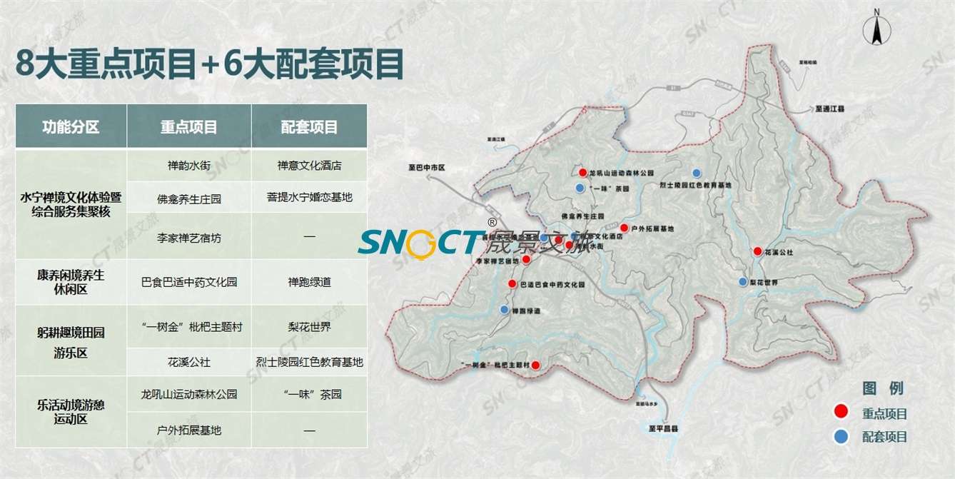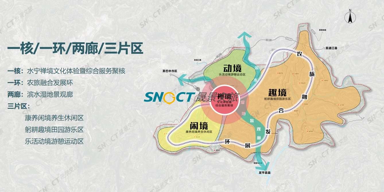 通過塑立水寧文化IP,回歸禪境藥鄉(xiāng)時光,完善配套服務(wù)設(shè)施等三大理念策略,助水寧寺突破現(xiàn)狀旅游困局。以“禪”為靈魂,以“養(yǎng)”為特色,以生態(tài)為載體,充分利用全域資源,經(jīng)營生態(tài)、經(jīng)營環(huán)境、經(jīng)營鄉(xiāng)村、經(jīng)營文化,通過“一核、一環(huán)、兩廊、三片區(qū)”空間結(jié)構(gòu)重塑,8大重點項目+6大配套項目的功能分區(qū)布局,“+旅游”,布局“2+2”產(chǎn)業(yè)融合發(fā)展模式,形成全鏈?zhǔn)桨l(fā)展,以實現(xiàn)將水寧寺鎮(zhèn)打造成禪養(yǎng)微度假目的地。