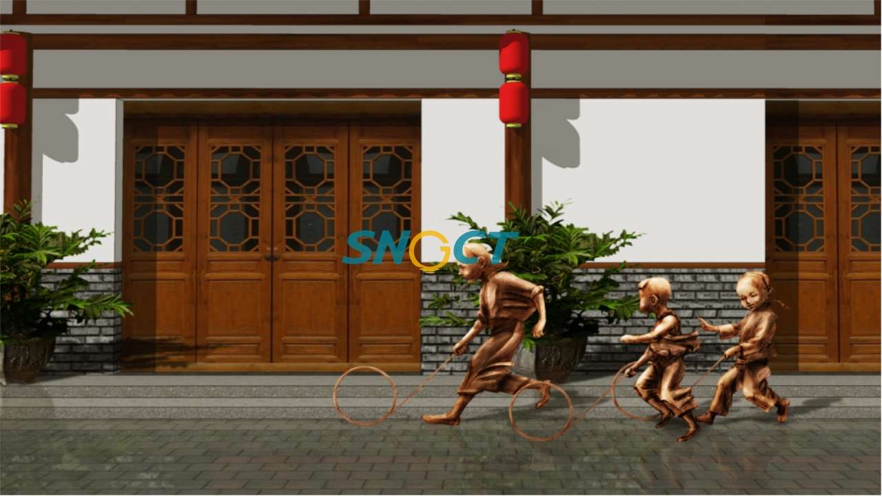 在晟景團隊為內江東興老街人文景觀進行提升設計期間,我們深入探尋甜城內江的歷史文化,通過地刻浮雕的形式將制糖的工藝流程展示在地面鋪裝上,另外配上吹糖人的實體雕塑,甜城記憶的主題節點巧妙地呈現在此。另外,東興老街的市井百態則通過多組雕塑勾勒再現各年齡階段、各業態的市井生活場景,讓游客在此處重拾原汁原味的老街記憶,在東興老街休閑游賞、娛樂、購物消費的同時感受時代趣味和文化氣息。